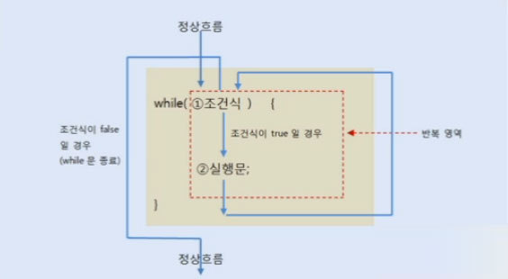 for문이 정해진 횟수만큼 반복한다면, while 문은 조건식이 true 일 경우에 계속해서 반복합니다.