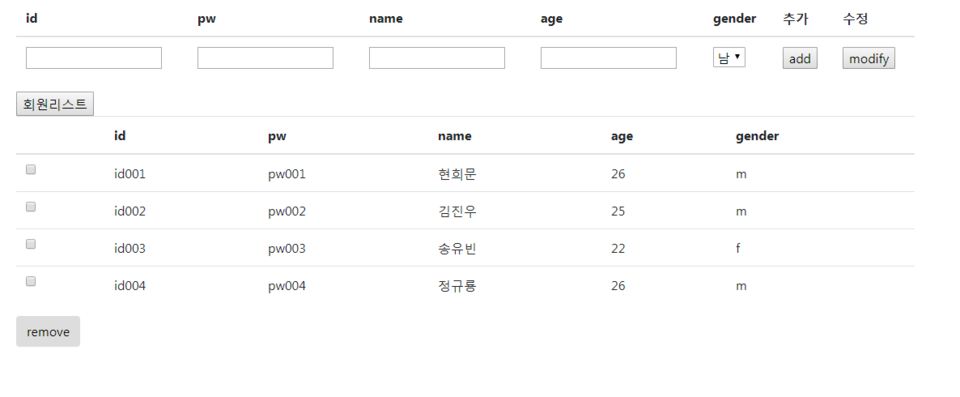 <!DOCTYPE> <html> <head> <meta charset="UTF-8"> <link rel="stylesheet" type="text/css" href="../../css/bootstrap.min.css"> <script src="../../js/jquery-3.3.1.min.js"></script> <script type="text/javascript" src="../../js/bootstrap.min.js"></script> <script> $(document).ready(()=> { // 삭제 $('#btn_remove').click(()=>{ var ck = []; $('.ck:checked').each((index,item)=>{ ck.push($(item).val()); }); $.ajax({ url:'/rest/MemberRemove' , type:'get' , data:{ck:ck} , dataType : 'json' , success:(item)=>{ let id=''; $(item).each((index,item)=>{ id +=`${item} `; }); alert(`${id}삭제`); $('#btn_list').trigger('click'); } , error : ()=>{ alert('삭제실패'); } }); }); // 추가 $('#btn_add').click(()=>{ var id = $('#id').val(); var pw = $('#pw').val(); var name = $('#name').val(); var age = $('#age').val(); var gender = $('#gender').val(); $.ajax({ url:'/rest/MemberAdd' , type:'POST' , data:{id:id,pw:pw,name:name,age:age,gender:gender} , dataType : 'json' , success:(item)=>{ alert(`${item.name}님 추가`); $('#btn_list').trigger('click'); } , error : ()=>{ alert('추가실패'); } }); }); // 수정 $('#btn_modify').click(()=>{ var id = $('#id').val(); var pw = $('#pw').val(); var name = $('#name').val(); var age = $('#age').val(); var gender = $('#gender').val(); $.ajax({ url:'/rest/MemberModify' , type:'POST' , data:{id:id,pw:pw,name:name,age:age,gender:gender} , dataType : 'json' , success:(item)=>{ alert(`${item.name}님 수정`); $('#btn_list').trigger('click'); } , error : ()=>{ alert('수정실패'); } }); }); // 목록 $('#btn_list').click(()=>{ $.ajax({ url:'/rest/MemberList' , type:'GET' , dataType : 'json' , success:(item)=>{ $('#list').empty(); $(item).each((index,item)=>{ let node = `<tr>`; node += `<td><input type="checkbox" class="ck" value="${item.id}"></td>`; node += `<td>${item.id}</td>`; node += `<td>${item.pw}</td>`; node += `<td>${item.name}</td>`; node += `<td>${item.age}</td>`; node += `<td>${item.gender}</td>`; node += `</tr>`; $('#list').append(node); }); } , error : ()=>{ alert('요청실패'); } }); }); }); </script> </head> <body class="container"> <table class="table"> <thead> <tr> <th>id</th> <th>pw</th> <th>name</th> <th>age</th> <th>gender</th> <th>추가</th> <th>수정</th> </tr> </thead> <tbody> <tr> <td><input type="text" id="id"></td> <td><input type="password" id="pw"></td> <td><input type="text" id="name"></td> <td><input type="text" id="age"></td> <td> <select id="gender"> <option value="m">남</option> <option value="f">여</option> </select> </td> <td><button id="btn_add">add</button></td> <td><button id="btn_modify">modify</button></td> </tr> </tbody> </table> <button id="btn_list">회원리스트</button> <table class="table"> <thead> <tr> <th></th> <th>id</th> <th>pw</th> <th>name</th> <th>age</th> <th>gender</th> </tr> </thead> <tbody id="list"> </tbody> </table> <button id="btn_remove" class="btn">remove</button> </body> </html>