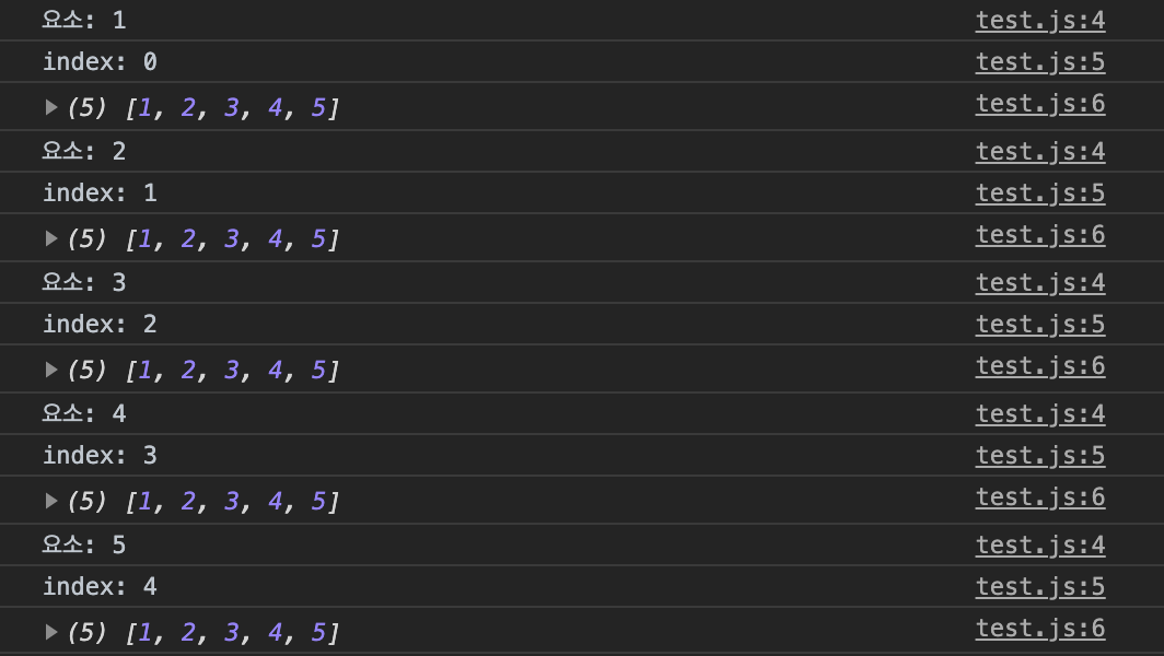 forEach 메서드도 세번째 배열은 잘 사용되지 않고 일반적으로 첫 번째 요소와, 두 번째 index가 많이 사용된다.