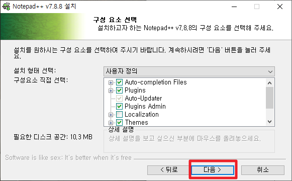 위의 단계를 지나면, 다음의 구성 요소를 선택할 수 있는 화면이 나타납니다. 여기에서 원하시는 구성을 선택하시고 [다음]을 클릭하여 주시길 됩니다.