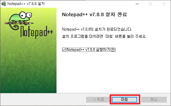 설치가 진행이 되고 나면, 다음과 같은 화면이 나타나서 설치가 완료됨을 나타내줍니다. 여기에서 노트 패드 실행 여부를 선택하셔서 [마침]버튼을 클릭하여 주시길 바랍니다.