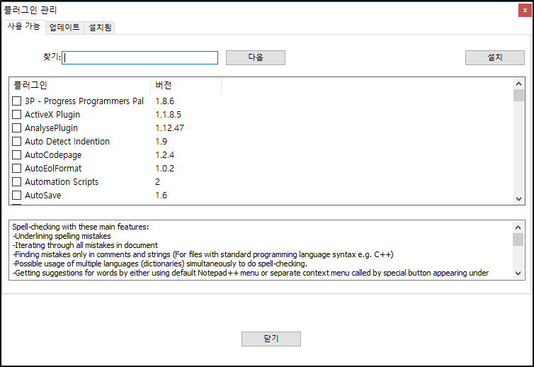 설치 버튼을 클릭하면 Notepad++가 재실행되면서 아래와 같이 설치 창이 표시됩니다. 재실행되면 플러그인이 설치되어 있습니다.