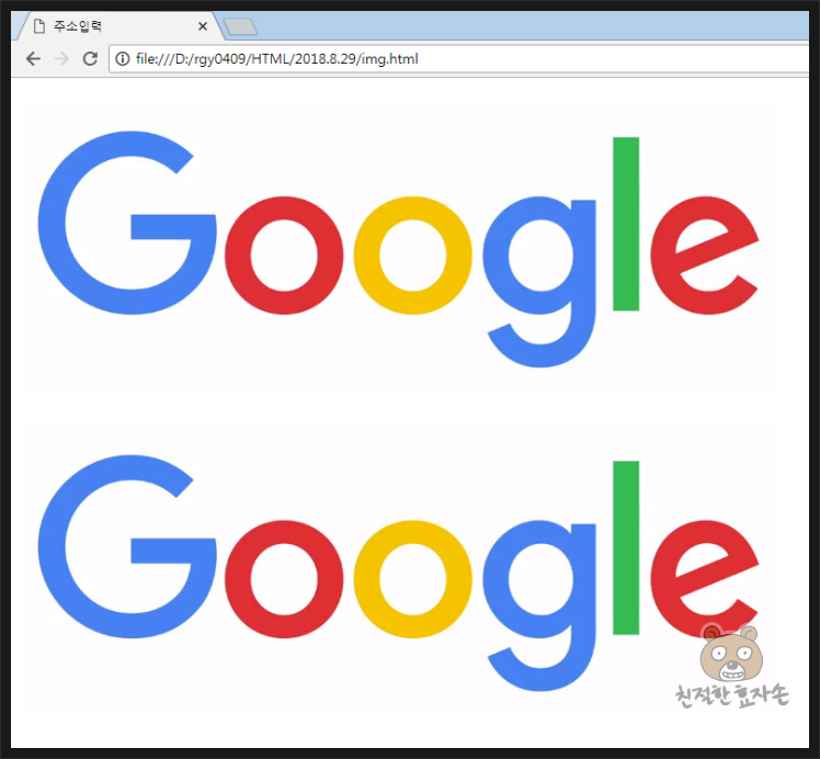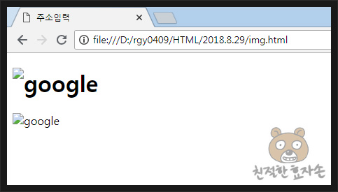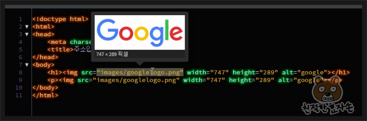 추가로, title 태그까지 같이 써주시면 마우스를 이미지 위에 올렸을 때, 해당 문구를 띄워줍니다. 지금 위의 경우에는 구글 로고 이미지에 마우스를 올리면 한글로 "구글" 이라고 나타나게 될 것입니다. 끝.